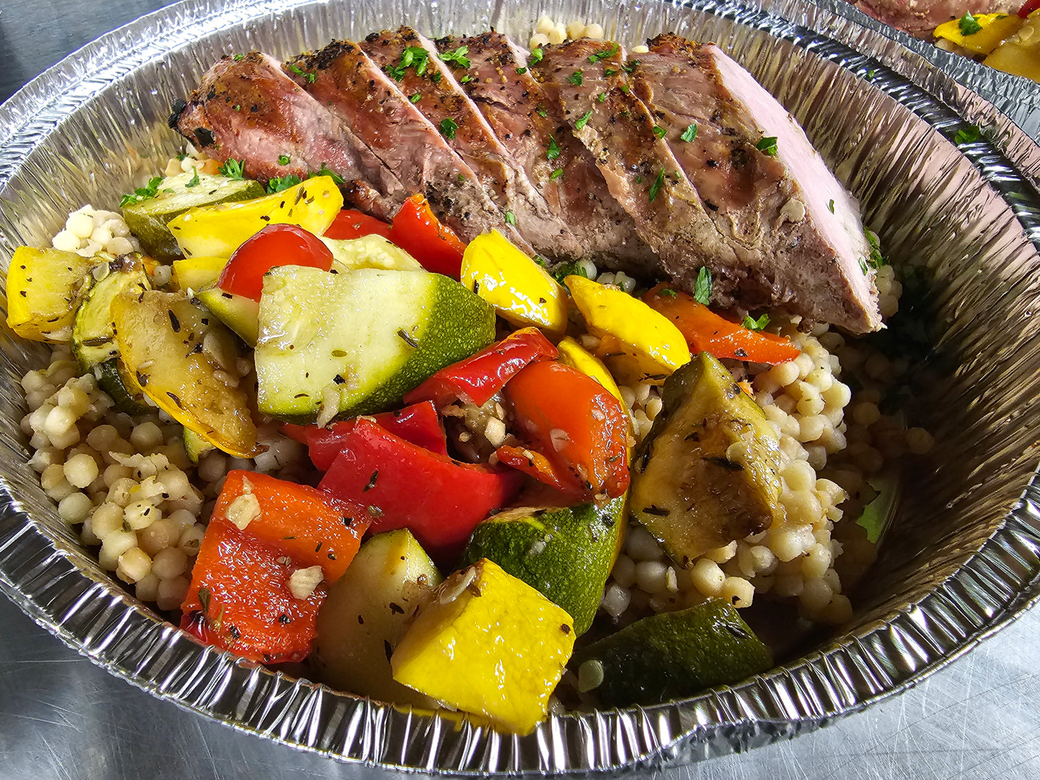 Grilled pork tenderloin with Tuscan couscous and roasted veggies, topped with a smoked tomato vinaigrette