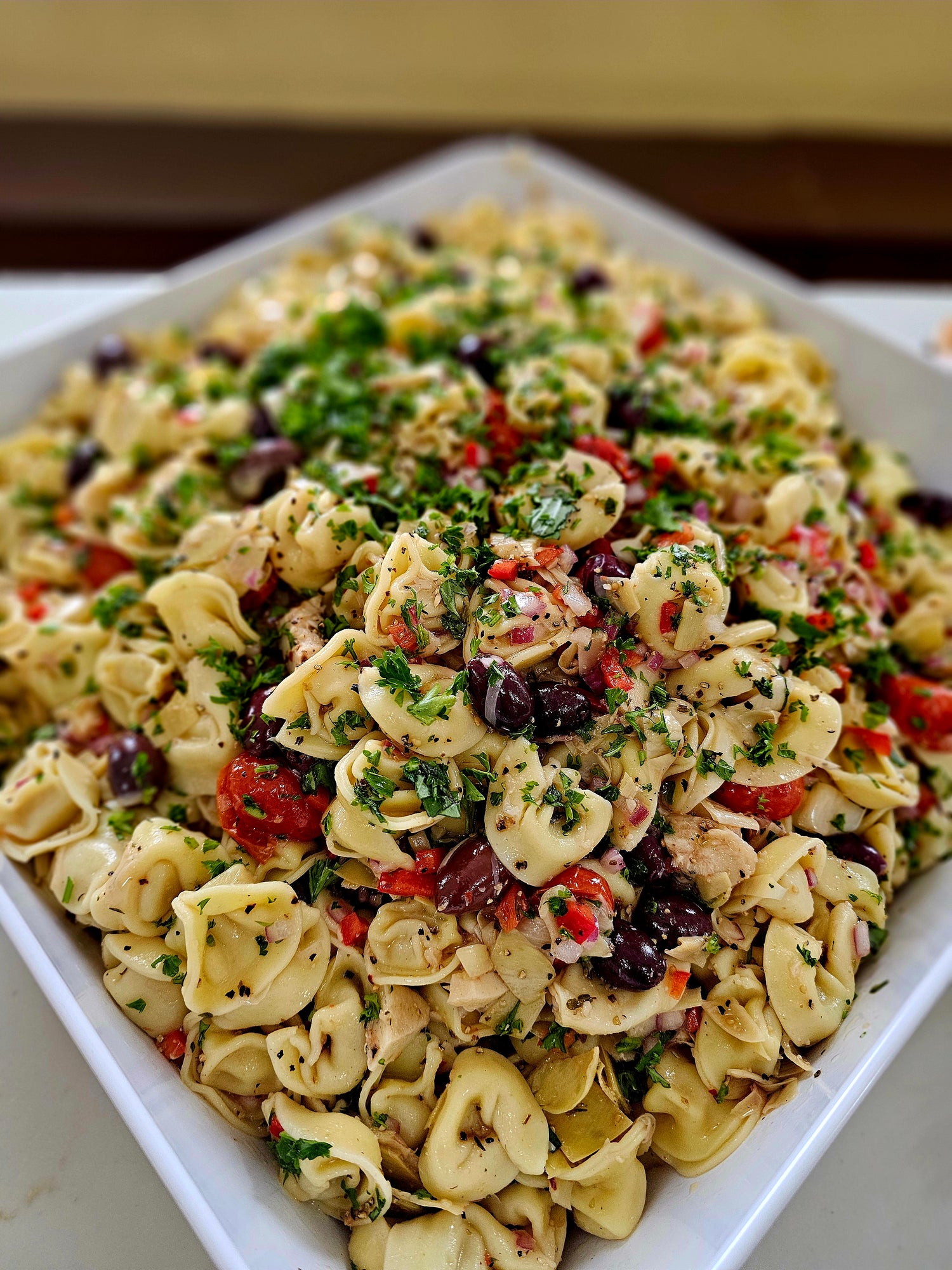 Mediterranean tortellini salad with fresh herb, feta cheese, and house made dressing
