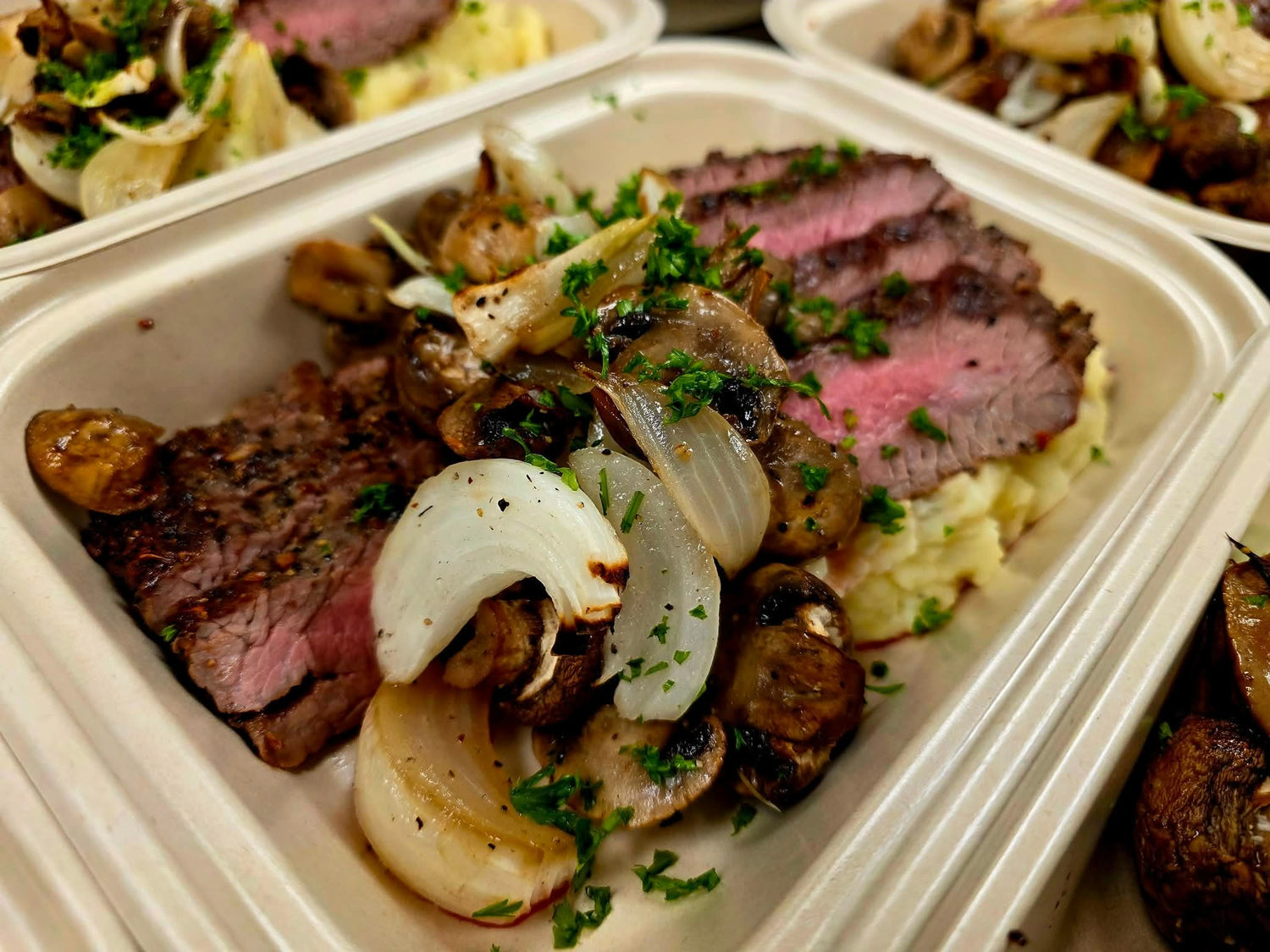 Grilled flank steak w/ roasted onions & mushrooms over mashed potatoes